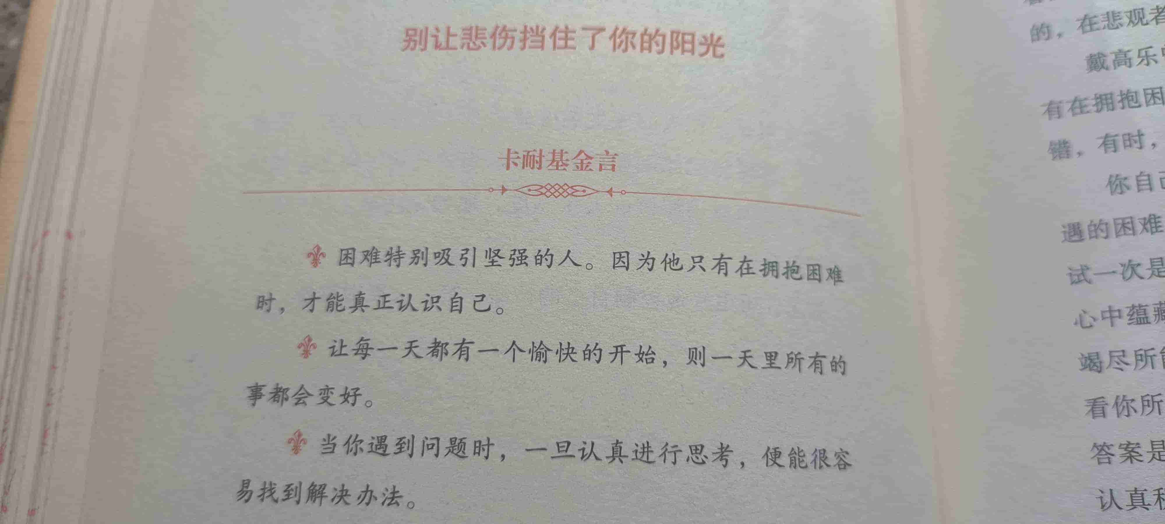 卡耐基在《人性的弱点》里说:不要让悲伤挡住了你的阳光。这句话的出发点是好的,鼓励我们要积极一点,但他的观点我并不完全认同。老卡先生想表达的是:无论遇到什么挫折与失败,都要保持良好的情绪和积极的心态,努力保持愉快然后解决问题。这个想法很棒,但问题在于这个世界上没有真正的乐天派,(那些在困境中保持乐观的情况看起来多少优点强颜欢笑),谁都会有悲伤、失落的时候,只不过有些人将其表露出来,有些人则将其深埋于心,仅此而已。