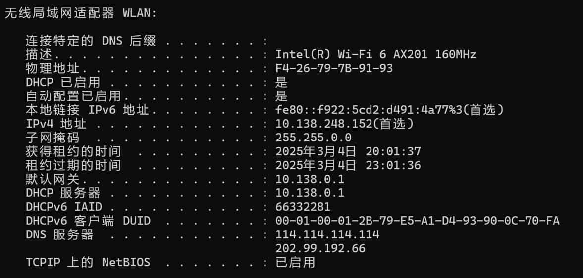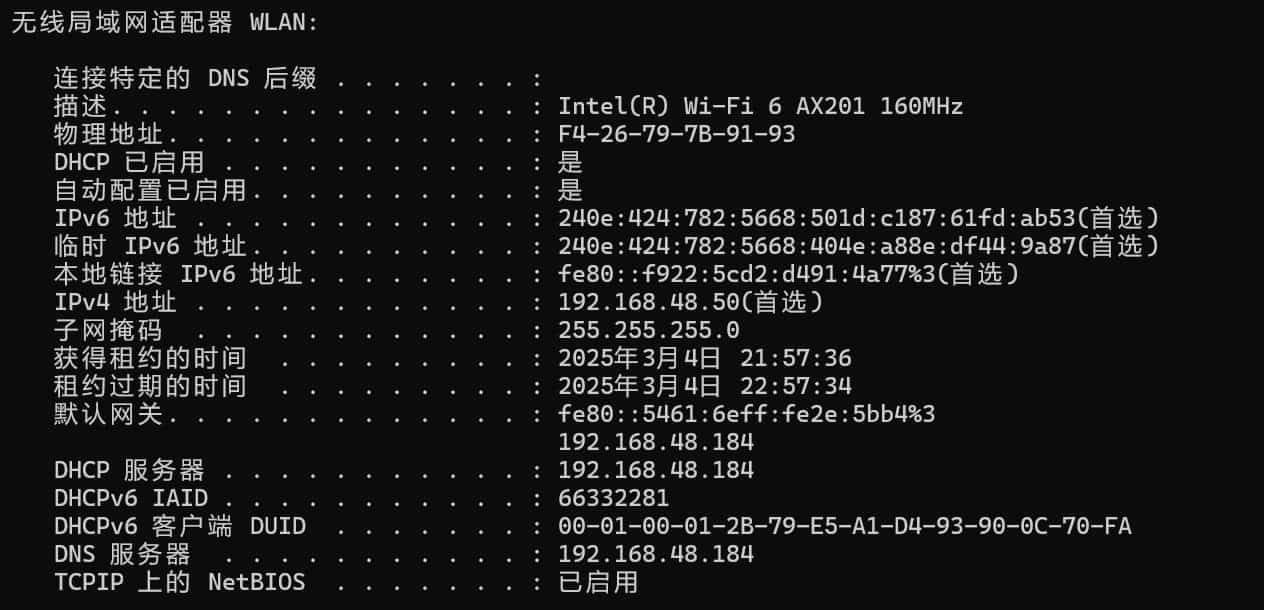 上图中,fe80::f922:5cd2:d491:4a77%3就是校园网分配的内网IPV6(外部无法访问)