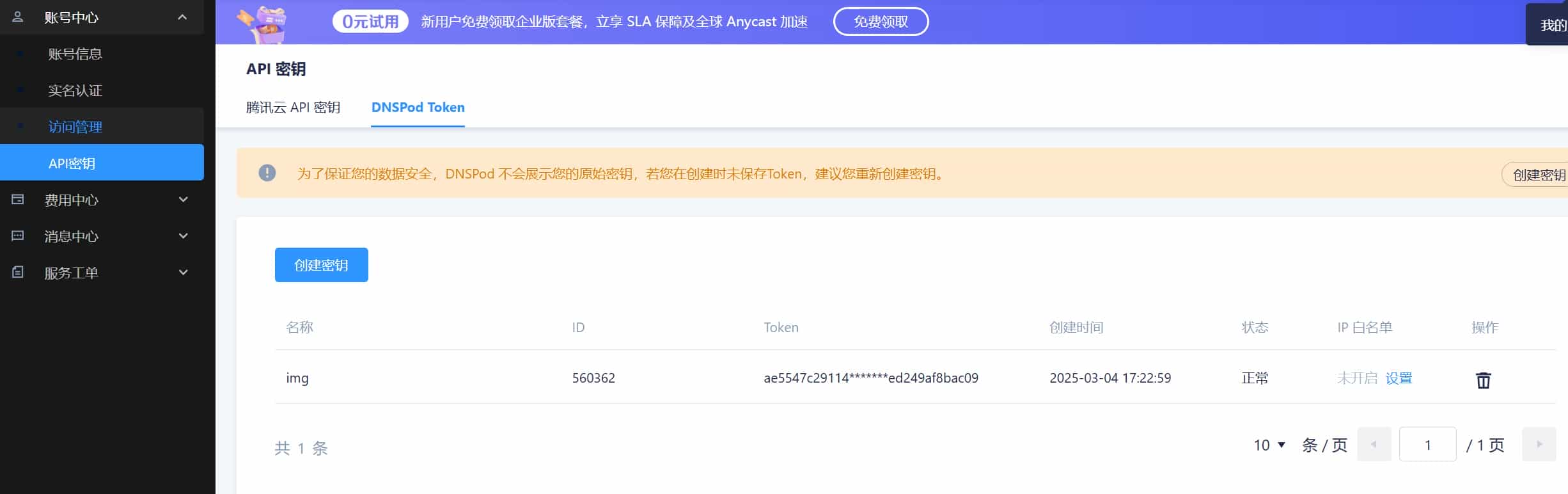 在我的账号-API密钥-DNSPOD TOKEN中,新建一个token,记录下id和token: