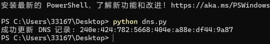 def get_ipv6(): try: response = requests.get("https://api64.ipify.org?format=json") return response.json().get("ip") except Exception as e: print(f"获取 IPv6 失败: {e}") return None