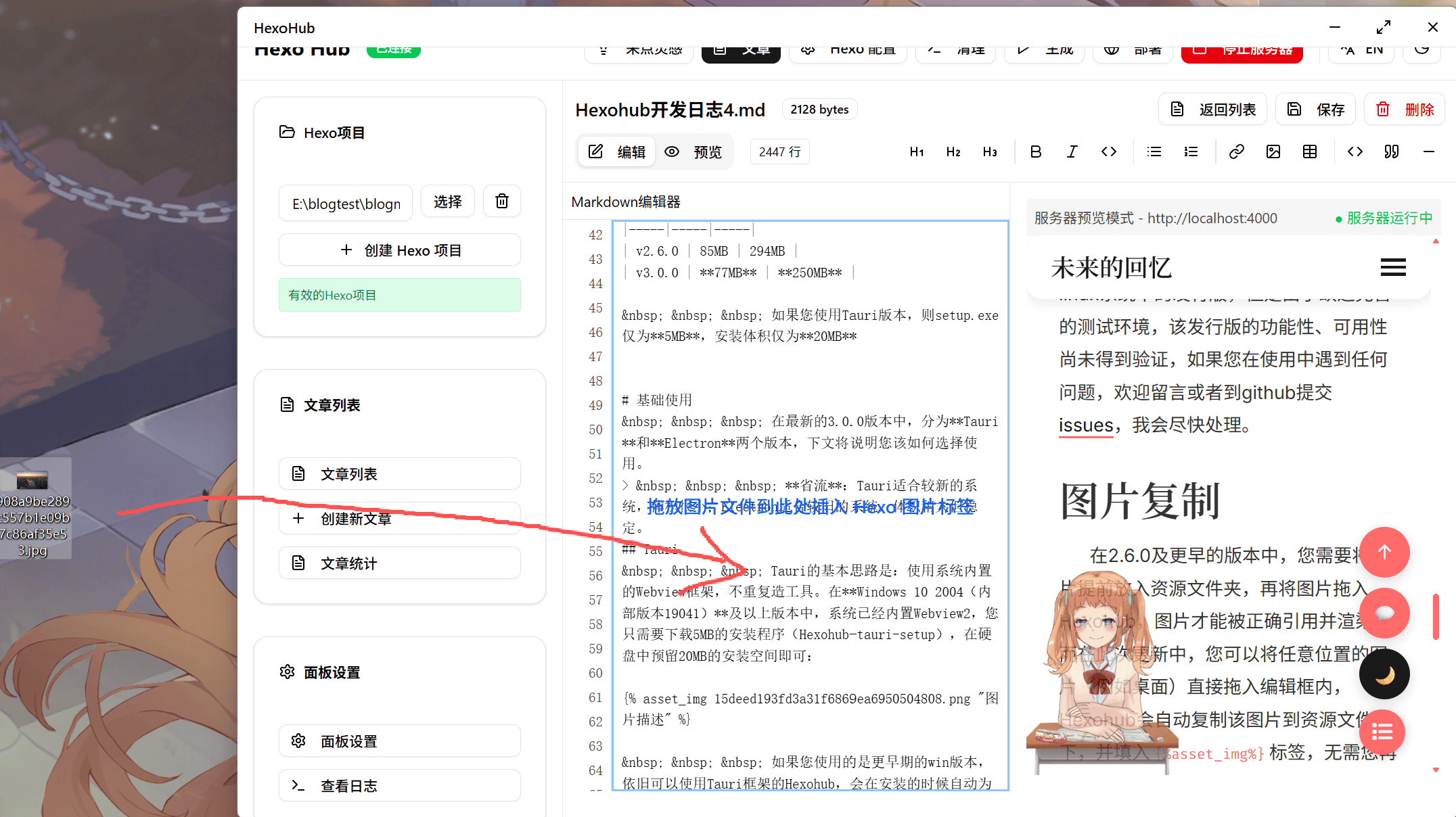 在2.6.0及更早的版本中,您需要将图片提前放入资源文件夹,再将图片拖入Hexohub,图片才能被正确引用并渲染。而在此次更新中,您可以将任意位置的图片(例如桌面)直接拖入编辑框内,Hexohub会自动复制该图片到资源文件夹下,并填入{%asset_img%}标签,无需您再动手操作文件。