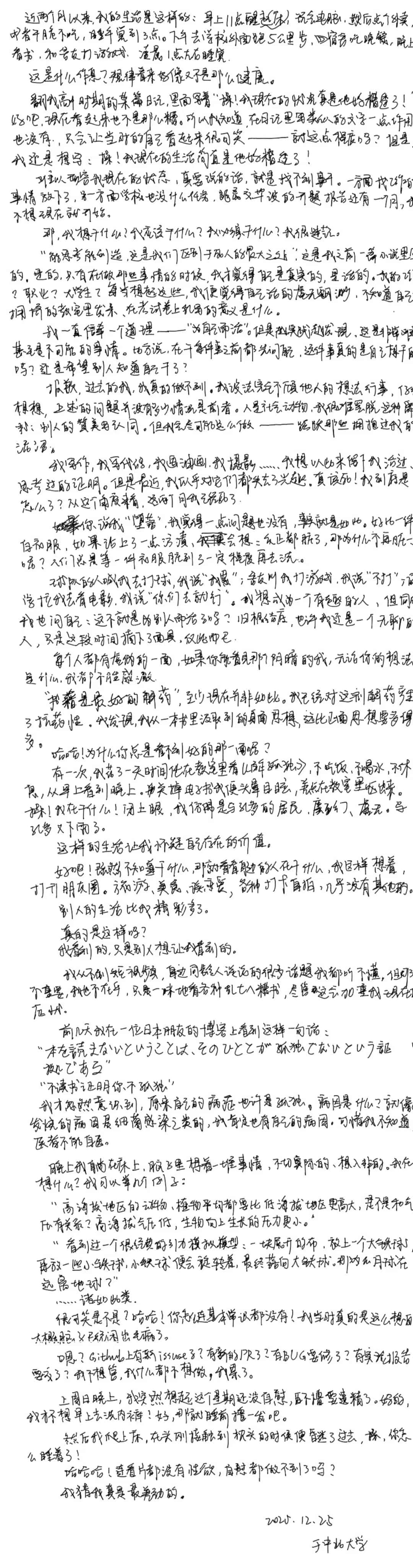 “能思考能创造,这是我们区别于死人的最大之处”,这是我之前一篇小说里写的。是的,只有在做那些事情的时候,我才觉得自己是真实的,是活的。我的工作?职业?大学生?
